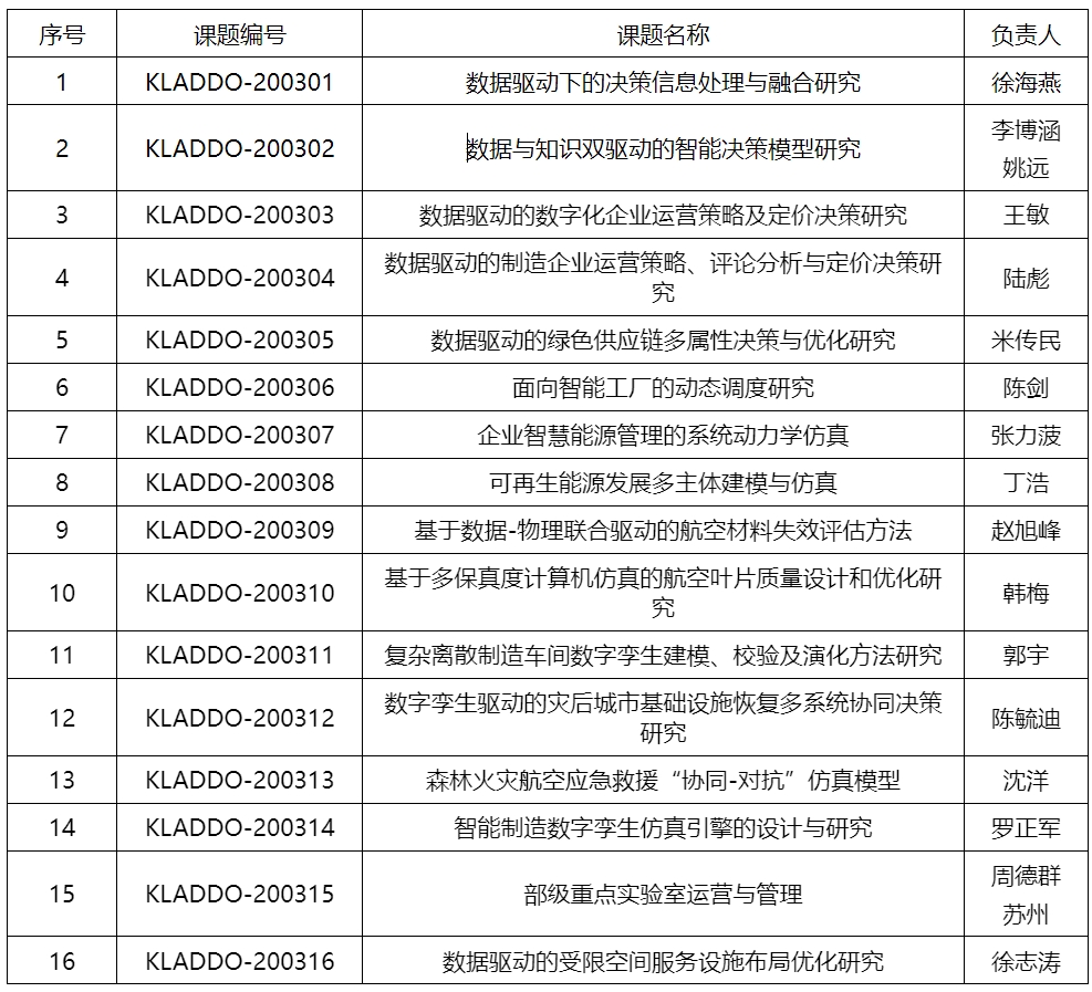 经过前期指南征集、优化与发布,收到30项课题申请书,按照《智能决策与数字化运营工业和信息化部重点实验室开放课题管理办法》,在专家评审和学术委员会审核后,立项课题16项,见下表。
